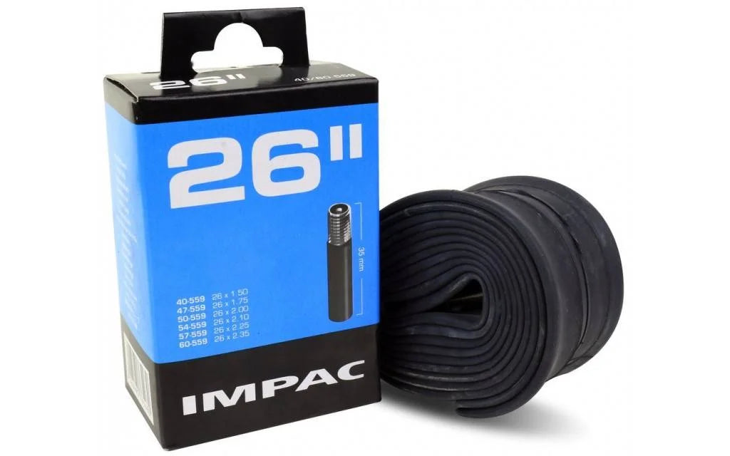 Impac inner tube , manufactured by Schwalbe. Delivered in a cardboard retail packaging. Specifications: Valve: Car valve 40mm Suitable for the following tire sizes: - 40-559, 26x1.50" - 47-559, 26x1.75" - 50-559, 26x2.00" - 54-559, 26x2.10" - 57-559, 26x2.26" -...