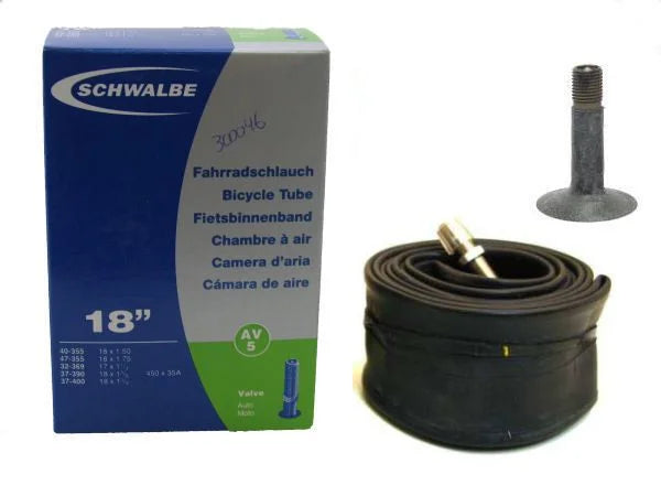 Schwalbe AV5 18" Inner Tube Specifications - 40mm Valve Valve type: Car valve / Schrader valve Valve length: 40 millimeters Weight: 95 grams The Schwalbe AV5 18" is suitable for the following tire sizes: 32-369 - 17 x 1 1/4...