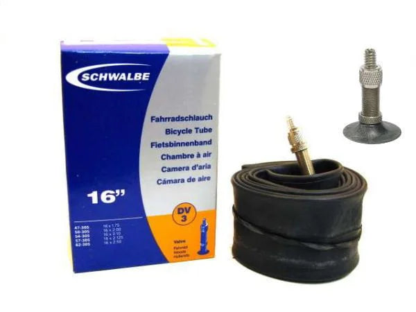 Schwalbe DV3 16" Inner Tube Specifications - 32mm Valve Valve type: Blitz valve / Dunlop valve / Dutch valve Valve length: 32 millimeters Weight: 115 grams The Schwalbe DV3 16" is suitable for the following tire sizes: 47-305 - 16...