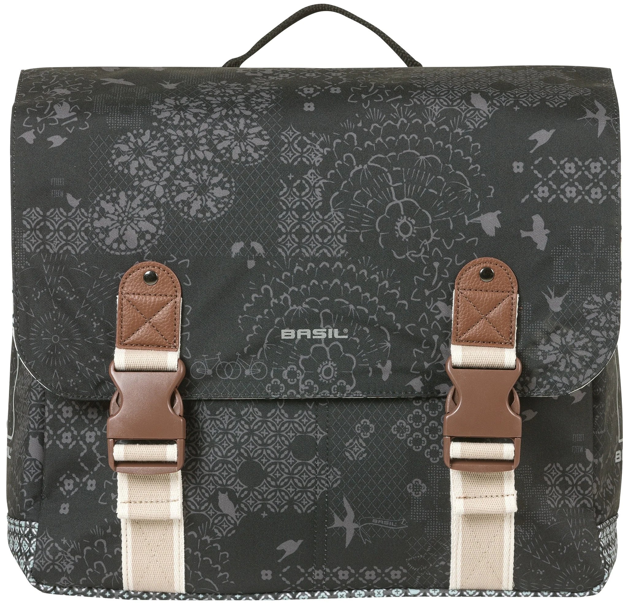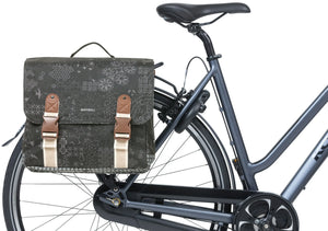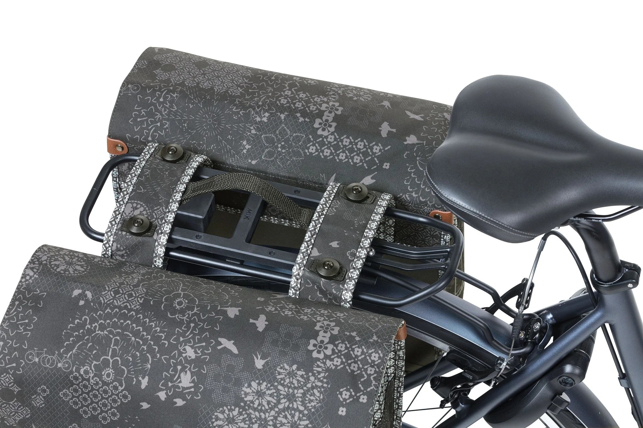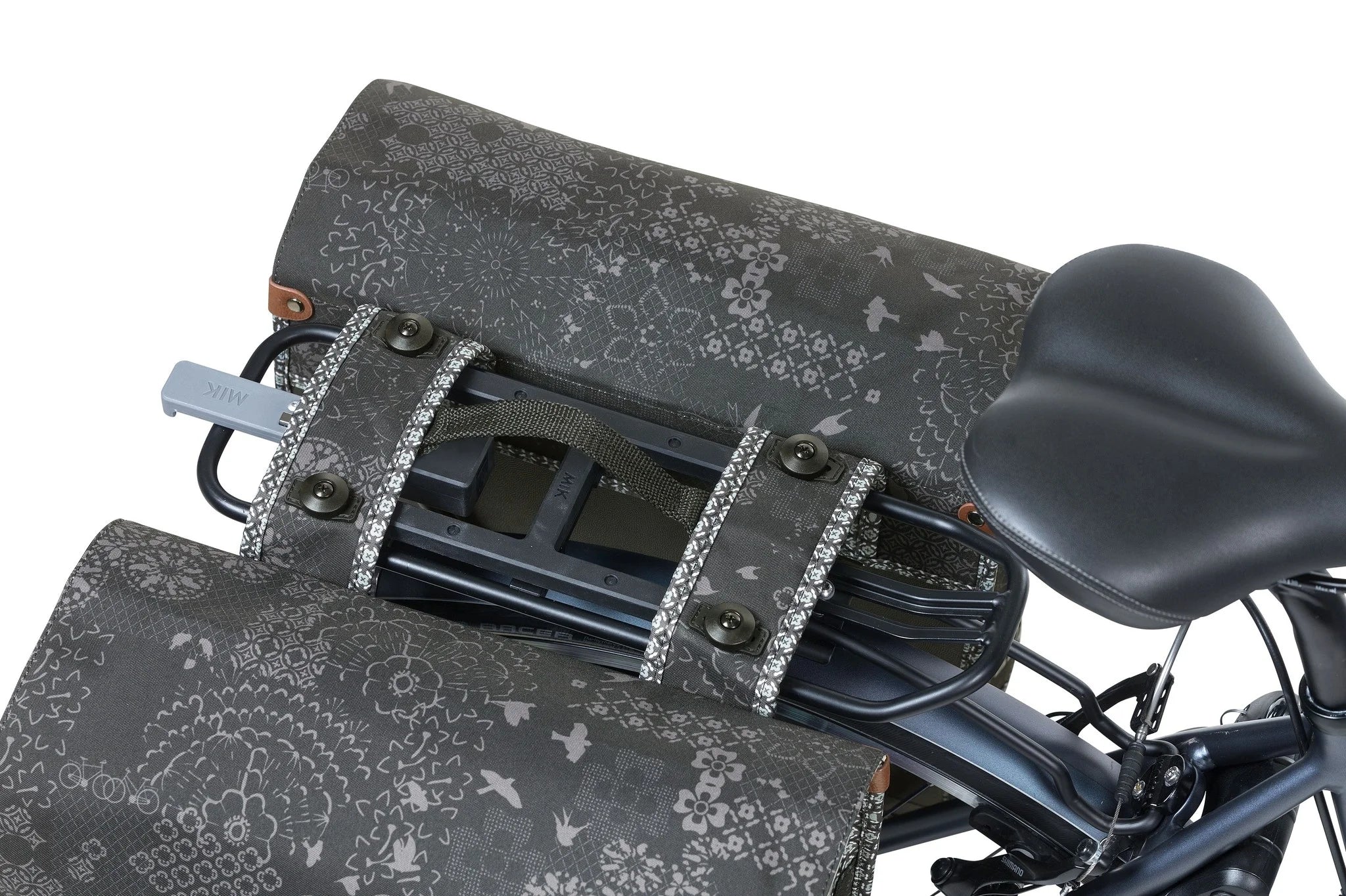 The Basil Bohème double pannier is a striking pannier with a unique design of abstract flowers and birds, making it a great addition to a women's bike. This functional green pannier is a welcome addition to grocery shopping. It's also perfect for long bike rides, offering ample storage for your packed lunch and rain gear. The pannier, with a total capacity of 35 liters and a lining, is made of water-repellent polyester. The Basil Bohème's faux leather details enhance its appeal and it closes easily with a drawstring. The pannier comes with a MIK adapter plate (70171), making it compatible with MIK system carriers and carrier plates. Finally, the Basil Bohème pannier features reflective elements on all sides for increased visibility in the dark. Permanent mounting: using the included straps. Removable: in combination with an adapter plate. Suitable for MIK and Racktime adapter plates. These adapter plates must be purchased separately. Features: Trendy design and color