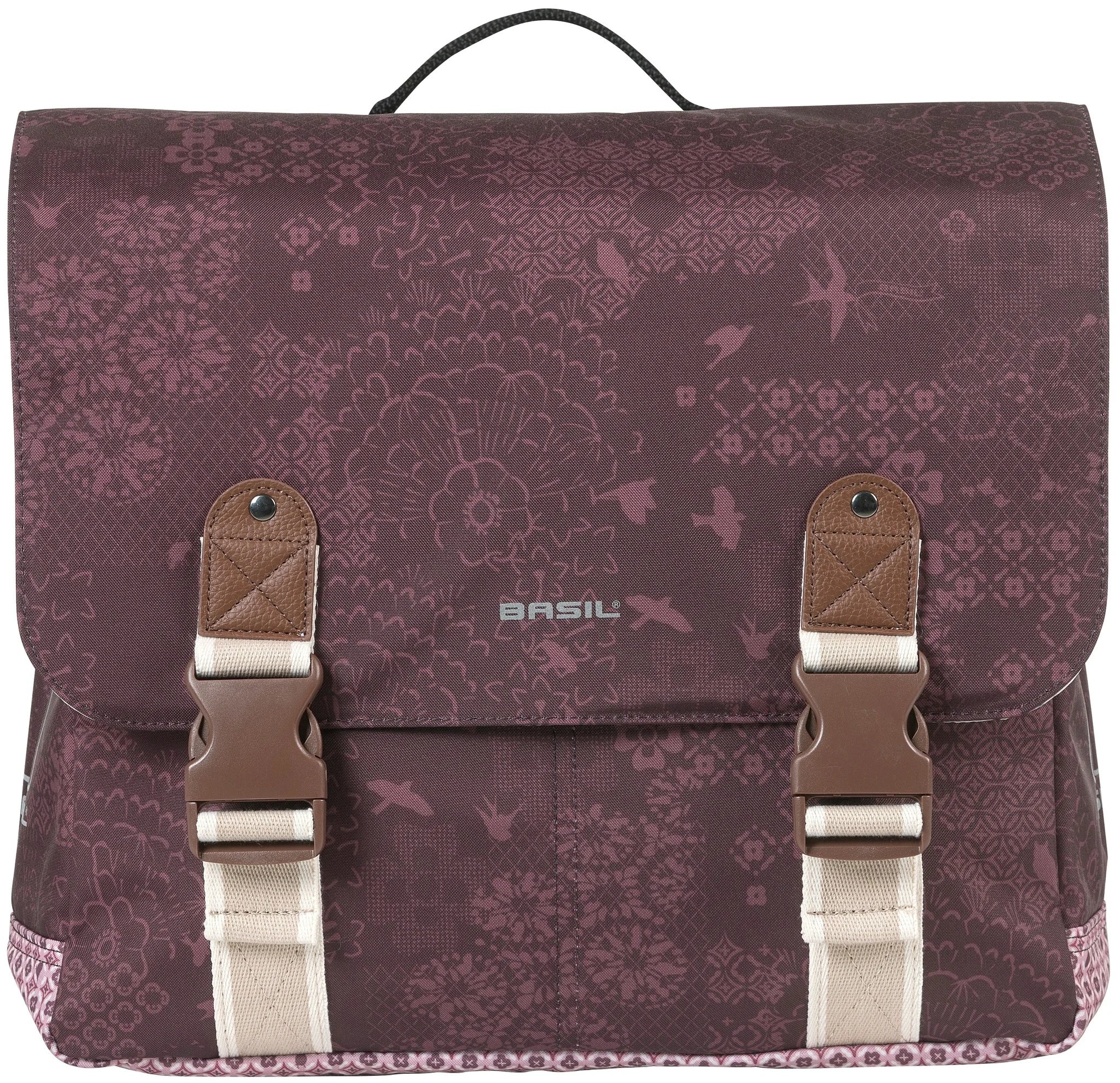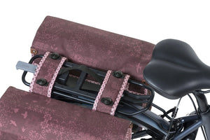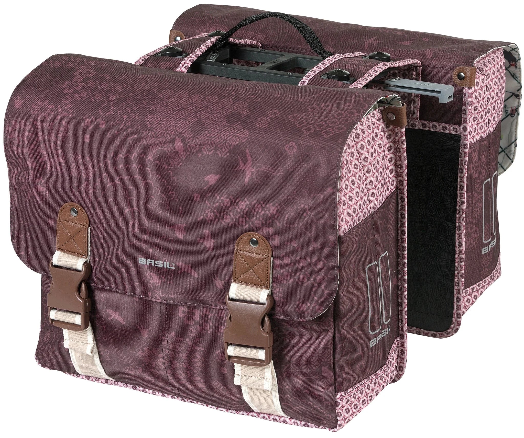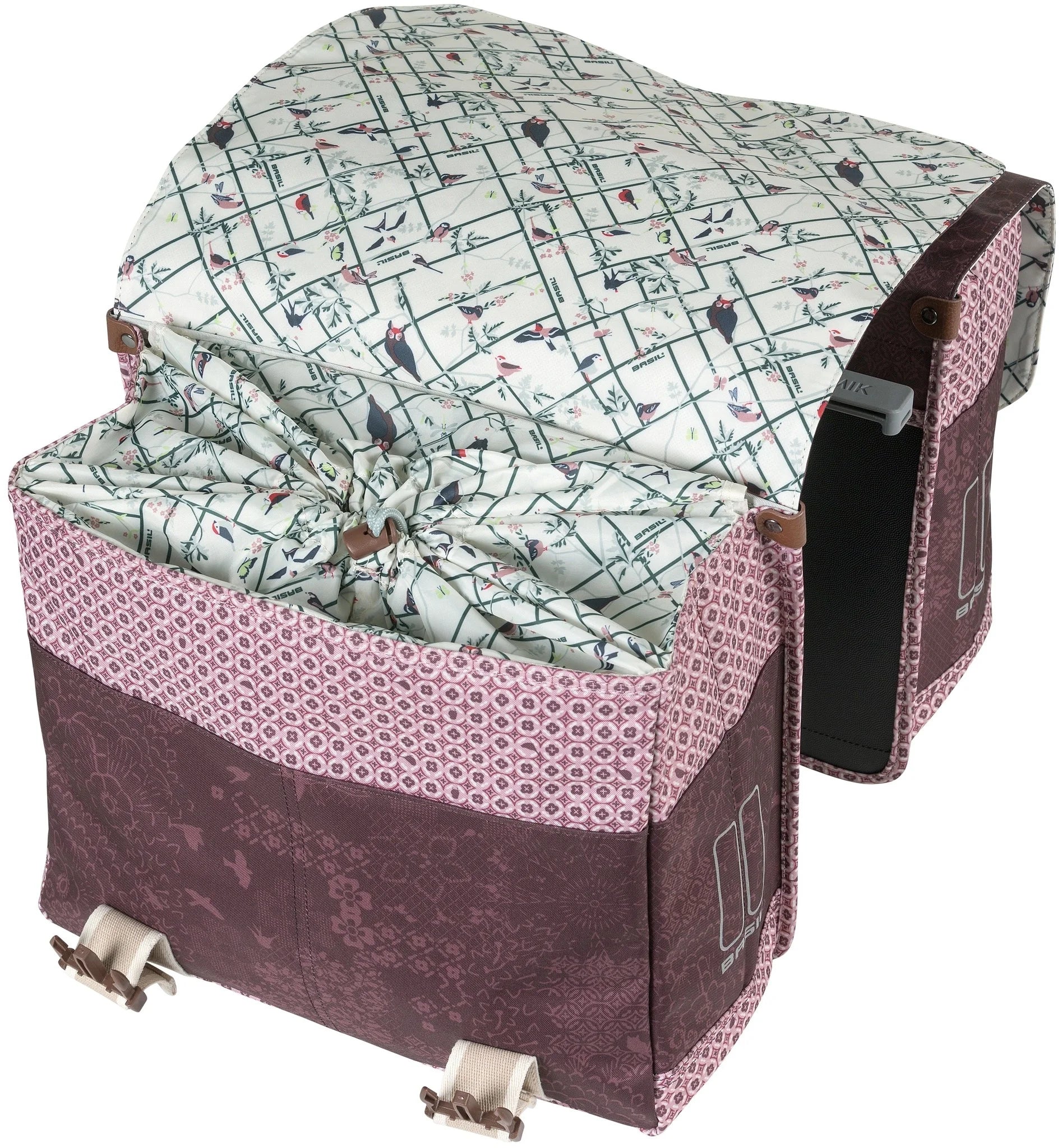 The Basil Bohème double pannier is a striking pannier with a unique design of abstract flowers and birds, making it a great addition to a women's bike. This functional green pannier is a welcome addition to grocery shopping. It's also perfect for long bike rides, offering ample storage for your packed lunch and rain gear. The pannier, with a total capacity of 35 liters and a lining, is made of water-repellent polyester. The Basil Bohème's faux leather details enhance its appeal and it closes easily with a drawstring. The pannier comes with a MIK adapter plate (70171), making it compatible with MIK system carriers and carrier plates. Finally, the Basil Bohème pannier features reflective elements on all sides for increased visibility in the dark. Permanent mounting: using the included straps. Removable: in combination with an adapter plate. Suitable for MIK and Racktime adapter plates. These adapter plates must be purchased separately. Features: Trendy design and color