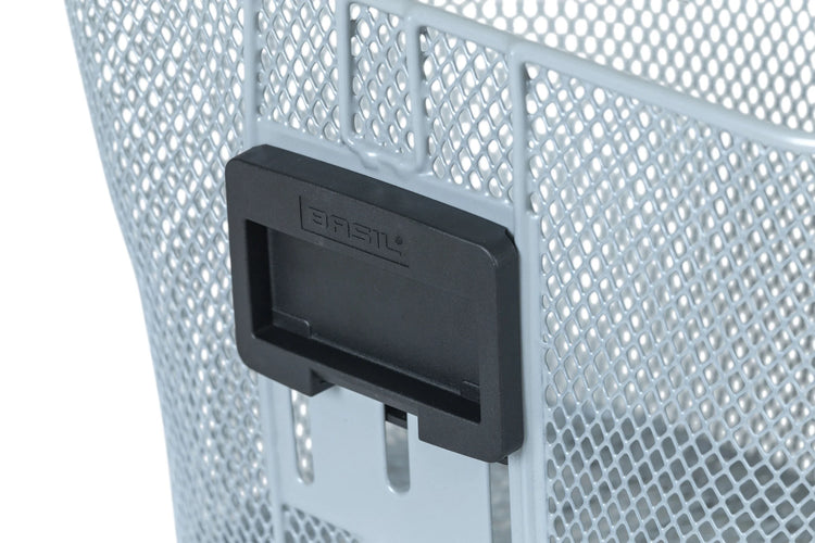 With the Basil Bremen KF front basket, you'll bring a stylish bike basket into your home. The silver, oval-shaped basket is made of fine-mesh steel and easily attaches to your bike's handlebars. This Basil bike basket comes with a Basil KF adapter plate (70158), making it suitable for mounting on a KF system (sold separately). The basket is height-adjustable using slots, so you'll always have your bike basket in view. The basket is removable, which is convenient for visits to the market or doing other errands. The handle, with a plastic grip, ensures a comfortable grip.
