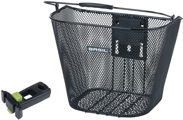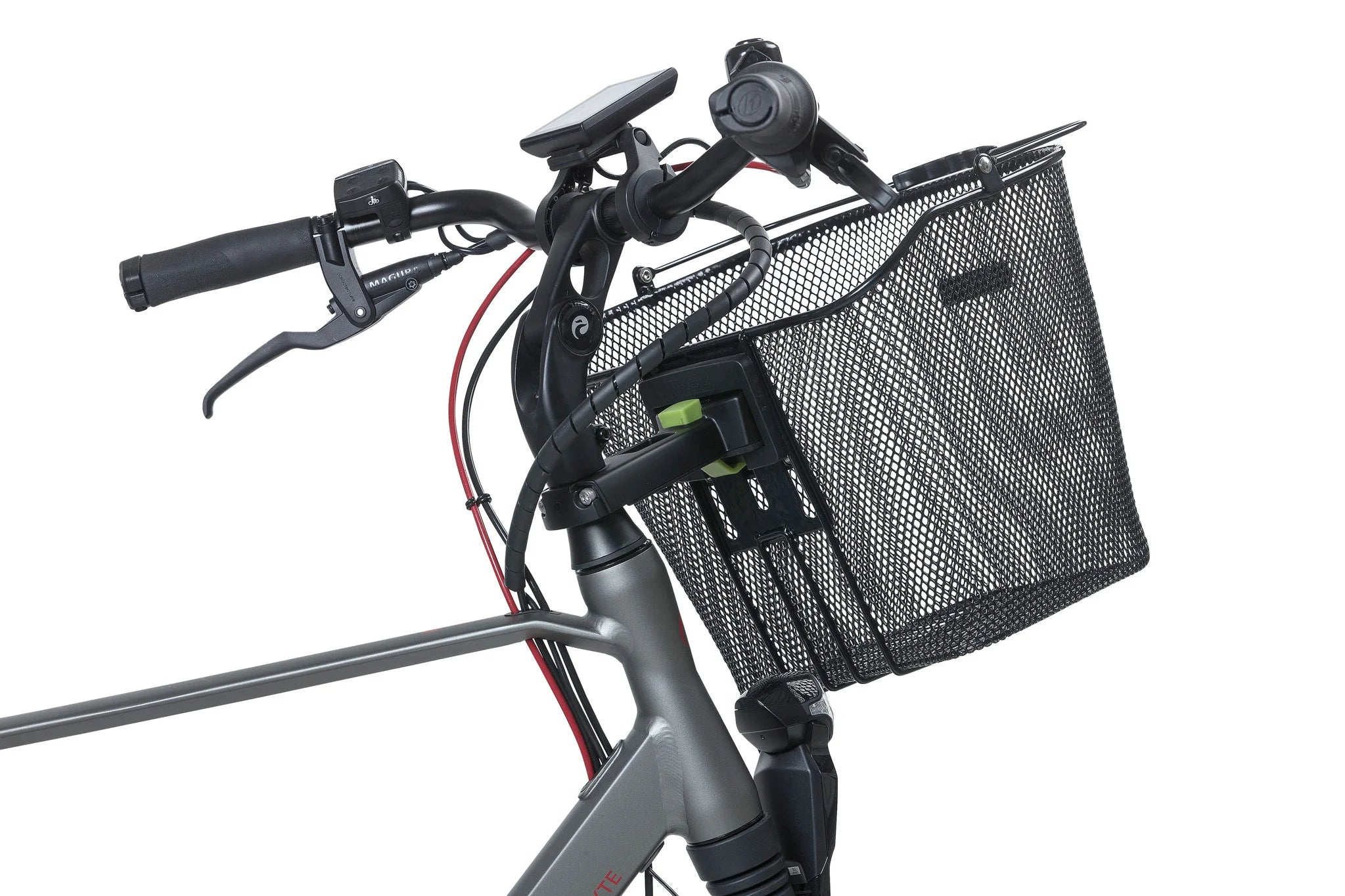 The Basil Bremen is a modern black oval-shaped bicycle basket for the front of your bike. This fine-mesh steel basket is ideal for grocery shopping or carrying a handbag. The basket is available with the Ahead Stem Mount KF (70189): a mounting system for the handlebars of a men's or women's bike. This keeps your belongings in view at all times. The basket is removable, making it easy to take to the market or shop. The handle, with a plastic grip, makes it comfortable to carry. This is especially useful if you're carrying a well-stocked basket back to your bike. The basket's height is adjustable using the slots in the mounting system.
