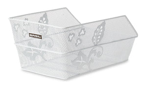 The Basil Cento Flower Bicycle Basket is a stylish white school bag basket for permanent mounting on the luggage carrier.