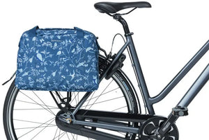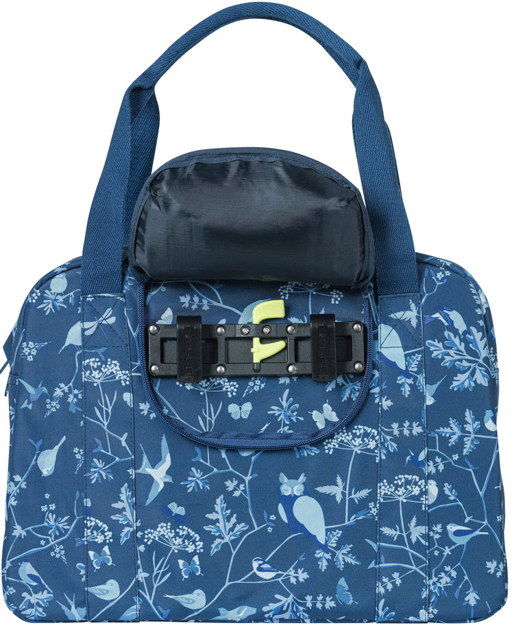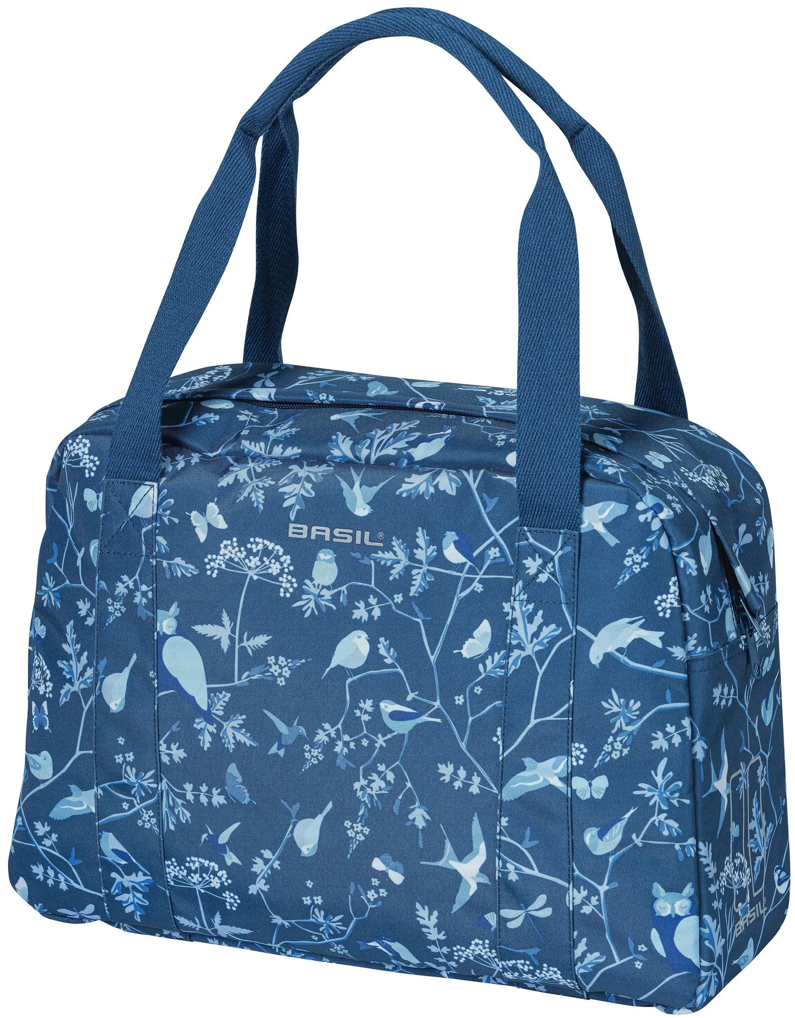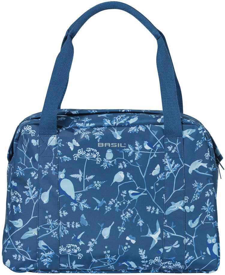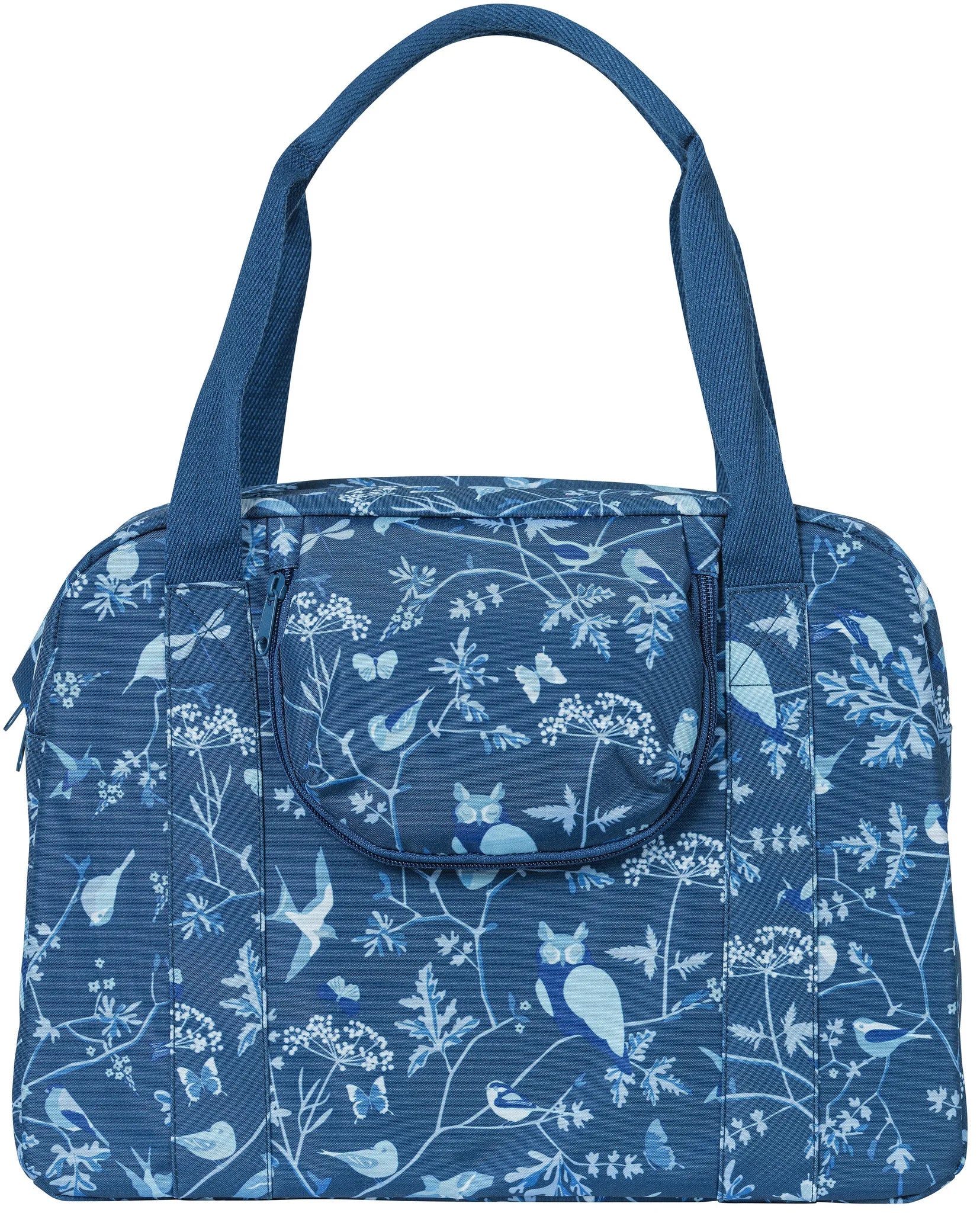 The Basil Wanderlust Carry All Bag is a handy bicycle shoulder bag in indigo blue. It features a cheerful bird print and easily attaches to your bike rack with the Hook-On system. The Basil Wanderlust Carry All Bag is a blue bicycle handbag with a colorful bird print. With this cheerful bicycle bag, you'll explore the world as free as a bird. Whether you're going on a bike trip with a friend or enjoying a picnic in the park, this bag will make your ride more fun and easier. Thanks to the water-repellent material, the contents of the bag stay dry despite a rain shower. The bag has a zipper, a sturdy lining, and handles so you can carry it over your shoulder or by hand. The Hook-On System makes it easy to attach the bicycle handbag to various bike racks (including e-bikes). Reflective details make you more visible in the dark. The bag has an 18-liter capacity and a spacious interior pocket, providing plenty of room for your daily necessities. Features:   Easy to hook onto various luggage carriers (also e-bikes) using the Hook-On System.