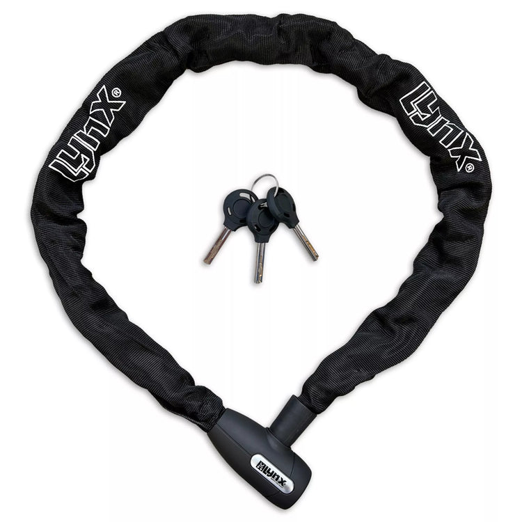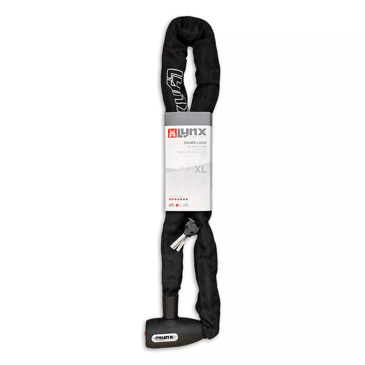 The Lynx Cityline XL chain lock features a 120 cm long, high-quality hardened steel chain with 10 mm thick square links. This black security lock is weatherproof and features the auto-click locking system*. The chain links are encased in a soft nylon sheath to prevent damage to the bicycle or moped. This chain lock comes standard with three keys.