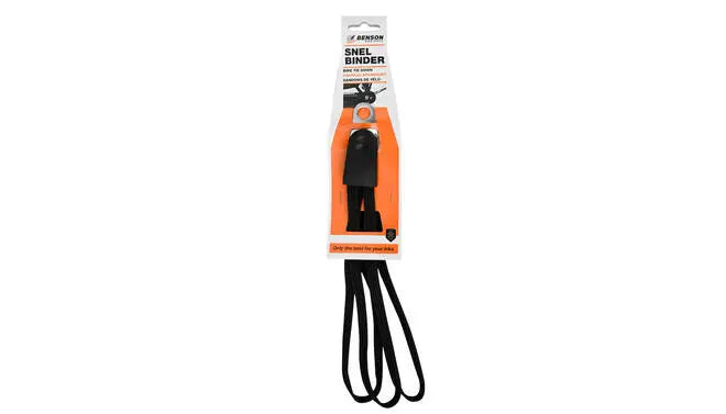 This black Benson quick-release strap set is a sturdy trio strap, suitable for 26" and 28" bikes. The strap can be easily clicked onto a bike with the stainless steel plates, provided it has the correct mounting. The strap can also be mounted to the bike's rear axle using the included universal axle plate mount and a ring spanner.