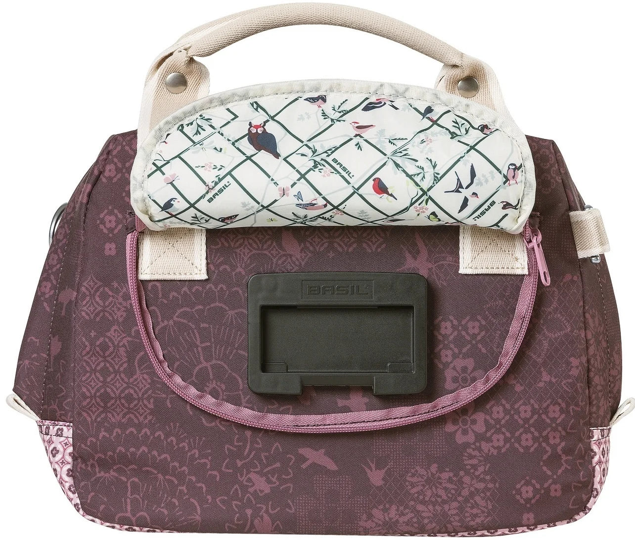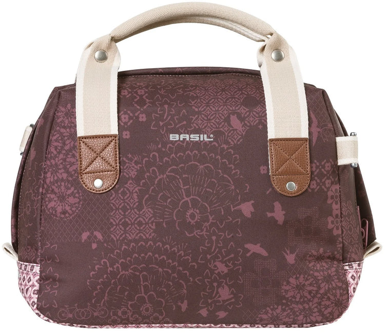 The Basil Bohème City Bag is an elegant green handbag, shoulder bag, and handlebar bag all in one, with a stylish bohemian print. Whether you're out for a bike ride to a terrace in the city or a day of shopping with a friend, you'll soon find yourself without this Bohème City Bag. The bag has a sturdy lining, a zippered pocket, and an 8-liter capacity. Plenty of room for your wallet, a bottle of water, and other necessities. The water-repellent polyester keeps your belongings dry during a light rain shower. The faux leather details and the cheerful bohemian print with a graphic cross-stitch pattern and bird silhouettes create a trendy look. Thanks to the detachable shoulder strap, the bag can also be worn as a shoulder bag. The bag can be attached using the pre-assembled Basil KF adapter plate. This allows you to easily click the bag onto a Basil KF handlebar mount, for example. This system is not included. The reflective details make you more visible in the dark. The Basil Bohème City Bag is available in several colors, including red and blue. The bag is part of the Basil Bohème collection. This Bohemian line also includes a double bag, a larger single bag, and matching bicycle accessories .     You will be extra visible in the dark thanks to the reflective details.