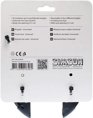 The Simson Normal Ring Lock is universally applicable to almost any frame. The lock comes with two keys and has a wide 5.7 cm opening, making it suitable for mounting on wide fenders. Simson offers you the option of ordering replacement keys. You can order additional keys using the code engraved on your key. Important! If the lock is ART-approved, you are usually required to notify your insurance company of the theft and order a new key if the key is lost or stolen . Product specifications: Ring lock
