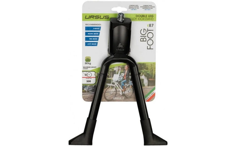 The sturdy Ursus Big Foot double kickstand is made of strong aluminum and is specifically designed for trekking and city bikes. It has a maximum load capacity of 50 kg. The Big Foot 28" is suitable for 28-inch bikes and has a leg length of 300 mm.