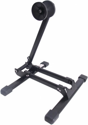 Eenvoudige inklapbare Edge achterwielstandaard, geschikt voor het stallen van vrijwel iedere fiets. De stabiele veerarm fixeert de fiets zonder het frame, de velg of spaken te beschadigen