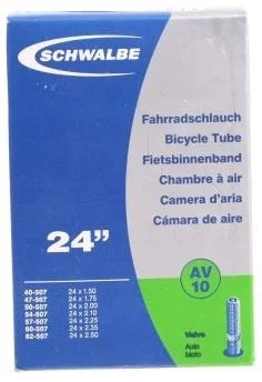 Specificaties binnenband Schwalbe AV10 24" - 40mm Ventiel Soort ventiel: Auto ventiel / Schrader ventiel Lengte ventiel: 40 millimeter Gewicht: 165 gram De Schwalbe AV10 24" is geschikt voor de volgende bandenmaten: 40-507 - 24 x 1.50 47-507 - 24...