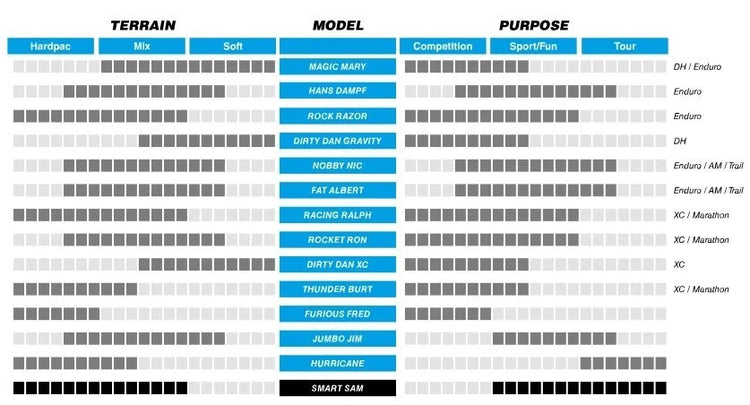 SMART SAM Wat maakt een nagenoeg all-rounder nog beter? Geen gemakkelijke opgave voor de Schwalbe technici. Het resultaat is echter geweldig. Het profiel van de Smart Sam is modern en robuust tegelijkertijd. De compacte middenril zorgt voor een aangenaam afrolgedrag, de hoekige buitenste noppen garanderen een optimale offroad grip. Daarmee voelt Smart Sam zich in elk terrein thuis maar rolt ook op de weg aangenaam licht.