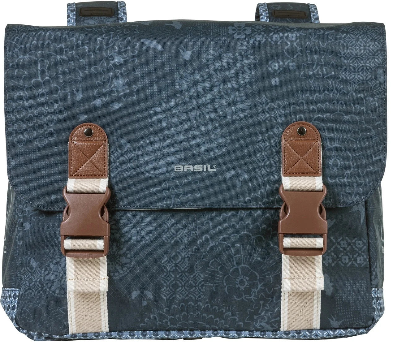 De Basil Bohème Double Bag is een dubbele blauwe fietstas met een stijlvolle bohemien print. Een fietsrit naar de supermarkt of een fietstrip met vriendinnen, deze fietstas maakt jouw fietsrit makkelijker en leuker.