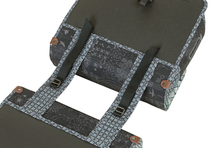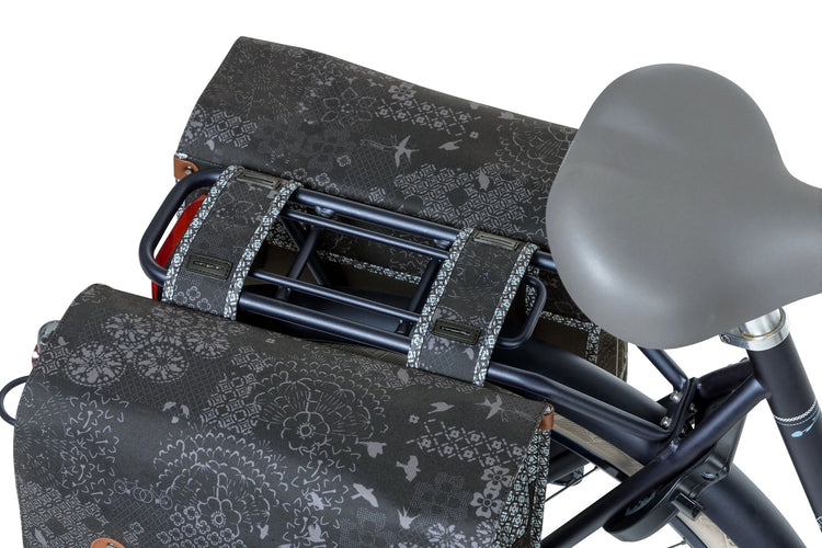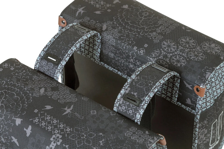 De Basil Bohème Double Bag is een dubbele zwarte (houtskoolachtige) fietstas met een stijlvolle bohemien print. Een fietsrit naar de supermarkt of een fietstrip met vriendinnen, deze fietstas maakt jouw fietsrit makkelijker en leuker.
