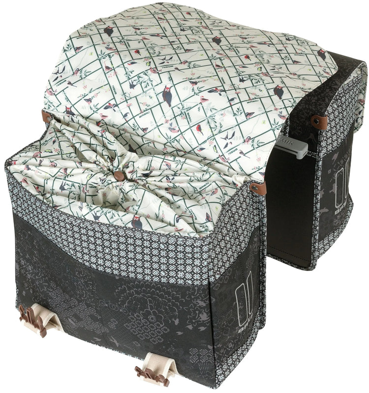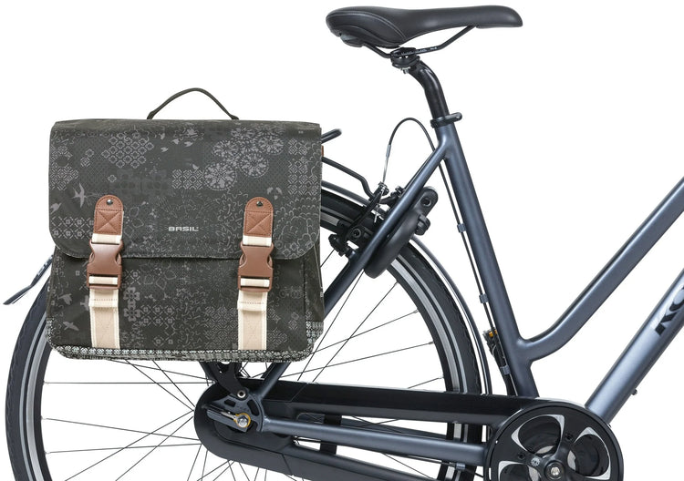 De Basil Bohème dubbele fietstas is een fietstas die opvalt door het unieke design van abstracte bloemen en vogels en is een leuke aanwinst voor een damesfiets. De functionele fietstas in de kleur groen is een aanwinst bij het doen van boodschappen. De tas komt echter ook van pas bij het maken van een lange fietsrit, want zo kun je er je lunchpakketje en regenkleding in kwijt. De fietstas, met een totale inhoud van 35 liter en binnenvoering, is gemaakt van waterafstotend polyester. De Basil Bohème krijgt extra uitstraling dankzij de kunstlederen details en sluit je gemakkelijk af met het aansnoerkoord. De fietstas wordt geleverd inclusief MIK Adapterplaat (70171) en is daardoor geschikt voor MIK-systeemdragers en -draagplaten. Tenslotte is de Basil Bohème-fietstas voorzien van reflectie op alle zijden, zodat je beter zichtbaar bent in het donker.     Vaste montage: met behulp van de meegeleverde riempjes.   Afneembaar: in combinatie met een adapterplaat. Geschikt voor adapterplaten van MIK en Racktime platen. Deze adapterplaten dien je apart aan te schaffen.     Eigenschappen:     Trendy design en kleur   Inclusief voorgemonteerde MIK-adapterplaat   Geschikt voor het MIK systeemdrager of carrierplat    Specificaties:   Model: Achtertas   Dubbel of enkel: Dubbel   Geschikt voor: Elektrische fiets, stadfiets, city-trekking fiets   Activiteit: Boodschappen, eropuit   Materiaal: Polyester   Kleur: Charcoal   Systeem: MIK Adapterplaat 70171 (inclusief)   Ook te gebruiken als: Nvt   Toepassing: Bagagedrager   Extra vak voor: Nvt   Sluiting hoofdvak: Kliksluiting   Laptopvak: Nee   Zijvak(ken): Nee   Voorvak(ken): Nee   Diefstalbeveiliging: Nee   Waterbestendig: Spatwaterdicht   Snelbinders mogelijk: Nee   Afneembaar: Afneembaar i.c.m. MIK-systeem   Handvat: Ja   Draagcapaciteit: 10 kg totaal, met een maximum van 5 kg per tas   Garantie: 2 jaar, via het verkooppunt waar je het product hebt gekocht   Binnenvak: Nee