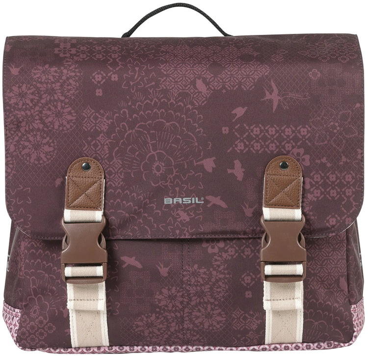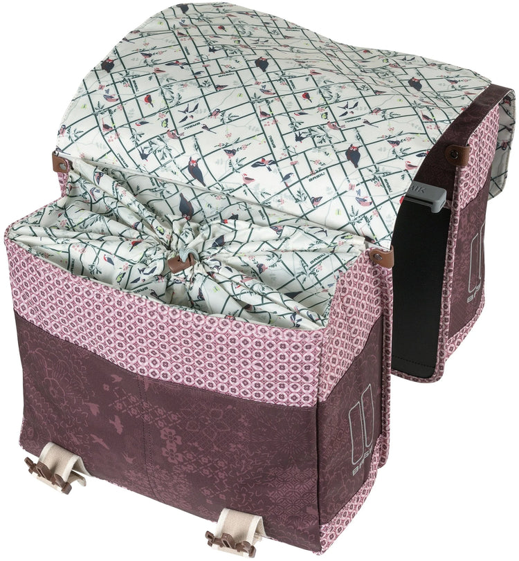 De Basil Bohème dubbele fietstas is een fietstas die opvalt door het unieke design van abstracte bloemen en vogels en is een leuke aanwinst voor een damesfiets. De functionele fietstas in de kleur groen is een aanwinst bij het doen van boodschappen. De tas komt echter ook van pas bij het maken van een lange fietsrit, want zo kun je er je lunchpakketje en regenkleding in kwijt. De fietstas, met een totale inhoud van 35 liter en binnenvoering, is gemaakt van waterafstotend polyester. De Basil Bohème krijgt extra uitstraling dankzij de kunstlederen details en sluit je gemakkelijk af met het aansnoerkoord. De fietstas wordt geleverd inclusief MIK Adapterplaat (70171) en is daardoor geschikt voor MIK-systeemdragers en -draagplaten. Tenslotte is de Basil Bohème-fietstas voorzien van reflectie op alle zijden, zodat je beter zichtbaar bent in het donker.     Vaste montage: met behulp van de meegeleverde riempjes.   Afneembaar: in combinatie met een adapterplaat. Geschikt voor adapterplaten van MIK en Racktime platen. Deze adapterplaten dien je apart aan te schaffen.     Eigenschappen:     Trendy design en kleur   Inclusief voorgemonteerde MIK-adapterplaat   Geschikt voor het MIK systeemdrager of carrierplat    Specificaties:   Model: Achtertas   Dubbel of enkel: Dubbel   Geschikt voor: Elektrische fiets, stadfiets, city-trekking fiets   Activiteit: Boodschappen, eropuit   Materiaal: Polyester   Kleur: Rood   Systeem: MIK Adapterplaat 70171 (inclusief)   Ook te gebruiken als: Nvt   Toepassing: Bagagedrager   Extra vak voor: Nvt   Sluiting hoofdvak: Kliksluiting   Laptopvak: Nee   Zijvak(ken): Nee   Voorvak(ken): Nee   Diefstalbeveiliging: Nee   Waterbestendig: Spatwaterdicht   Snelbinders mogelijk: Nee   Afneembaar: Afneembaar i.c.m. MIK-systeem   Handvat: Ja   Draagcapaciteit: 10 kg totaal, met een maximum van 5 kg per tas   Garantie: 2 jaar, via het verkooppunt waar je het product hebt gekocht   Binnenvak: Nee