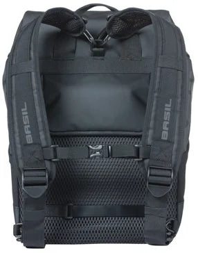 De Basil Miles Tarpaulin daypack Nordlicht is een waterdichte zwarte fietsrugzak voor zowel een mannen- als een vrouwenfiets. Deze praktische en sportieve rugzak heeft een inhoud van 17 liter. Is het een rugzak? Is het een fietstas? Nee, het is een fietsrugtas! Deze handige en sportieve tas haak je met het Hook-On systeem gemakkelijk aan je bagagedrager. Wil je offroad te voet de natuur intrekken, dan draag je de rugzak comfortabel op je rug. De fietsrugzak heeft een gewatteerd achterpand en gewatteerde schouderbanden. Doordat je de Basil Miles Tarpaulin fietsrugzak Nordlicht aan je bagagedrager meeneemt, voorkom je dat je zweterig op je bestemming aankomt. En omdat het gewicht van de tas een stuk lager zit, fiets je veel stabieler (en daarmee veiliger). Ideaal voor als je een korte of lange recreatieve fietstocht wilt maken. Of als je op fietsvakantie wilt gaan. Gemaakt van waterdicht matzwart Tarpaulin. De waterdichte tas heeft een roltopsluiting en getapete naden, en kan dus tegen een flinke regenbui. Jouw spullen blijven tijdens het fietsen dus droog. In de diverse vakken berg je makkelijk je spullen op. Ideaal voor je boeken, smartphone, pennen. Dankzij de Nordlicht Technology* ben je beter zichtbaar in het donker. Aan de voorzijde van de tas zit een LED-strip verwerkt, die je met een drukknop kunt bedienen. Eigenschappen: