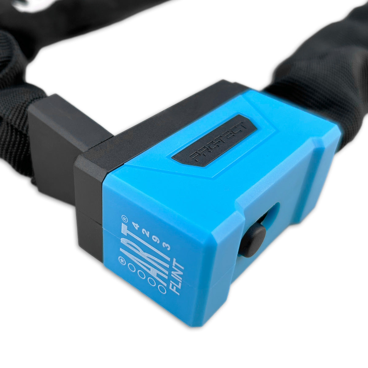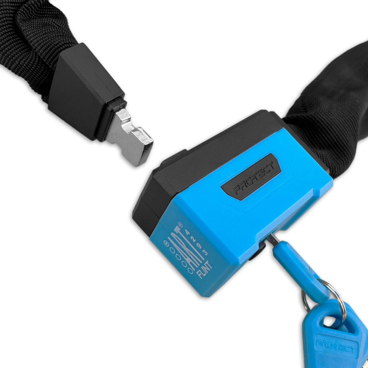 De Pro-tect Flint is een 110 cm lang kettingslot met het ART 1 keurmerk. Dit ART 1 keurmerk maakt de Flint bij uitstek geschikt als tweede slot voor duurdere fietsen, zoals bakfietsen en E-bikes. Met een gewicht van slechts 1465 gram, biedt de Flint maximale veiligheid tegen minimale last. Daarnaast zijn de schakels van het kettingslot voorzien van een zachte textielhoes om lakschade aan het frame te voorkomen. Verder heeft de slotkop een verschuifbaar afdekkapje welke er voor zorgt dat er geen vuil en vocht in de cilinder terecht komt. Met schuifkaart.