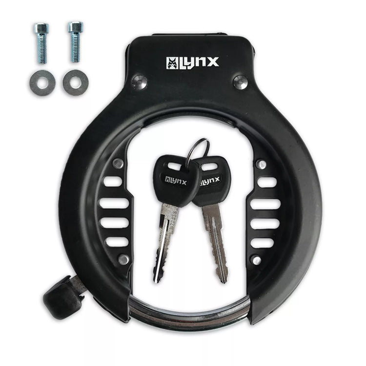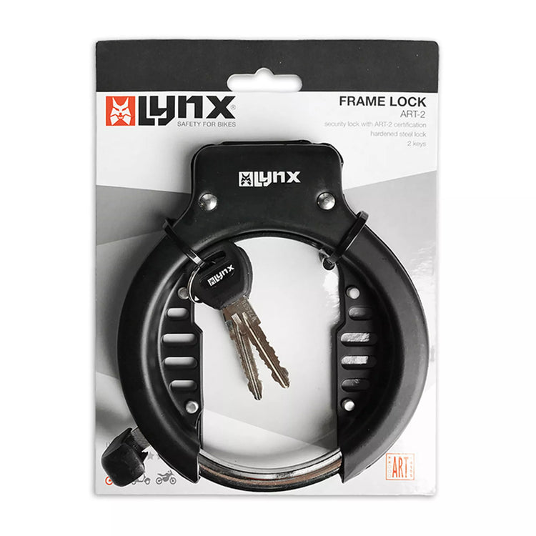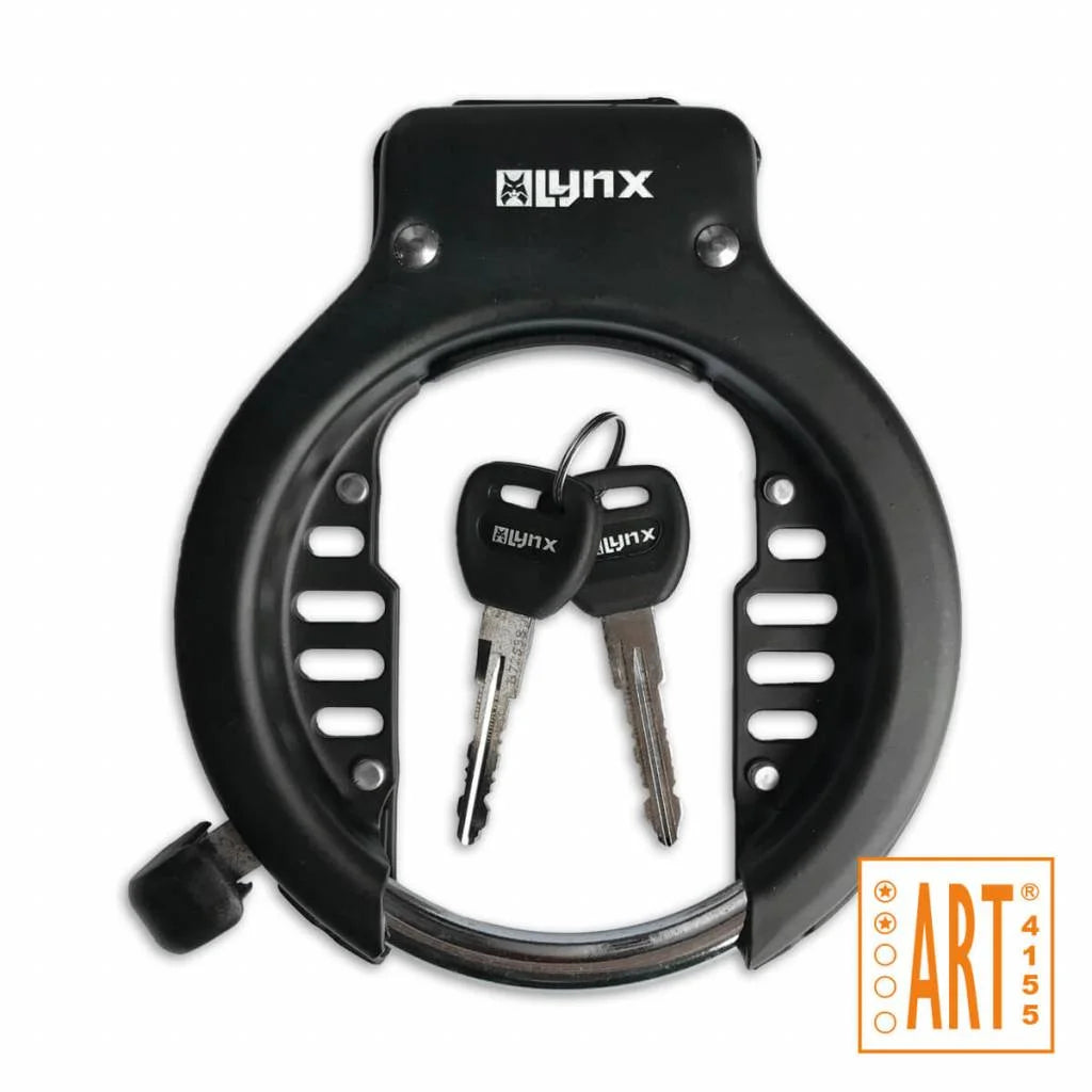 Het ART-2 goedgekeurde ringslot van Lynx. Optimaal beschermd tegen openbreken, met een 10 mm gehard stalen beugel. Dit zwarte frameslot is geschikt voor diverse type fietsen en wordt geleverd met 2 sleutels