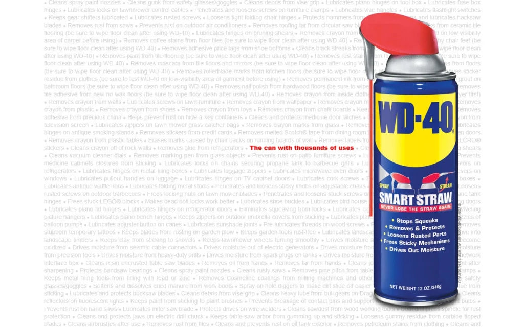 Net als zijn voorganger, beschermt WD40 Smart Straw metaal tegen roest en corrosie, kruipt in vastzittende onderdelen, verdrijft vocht en smeert het bijna alles.