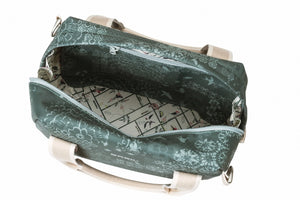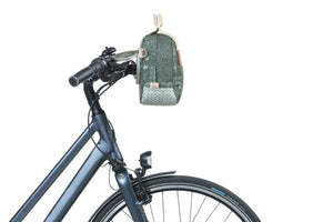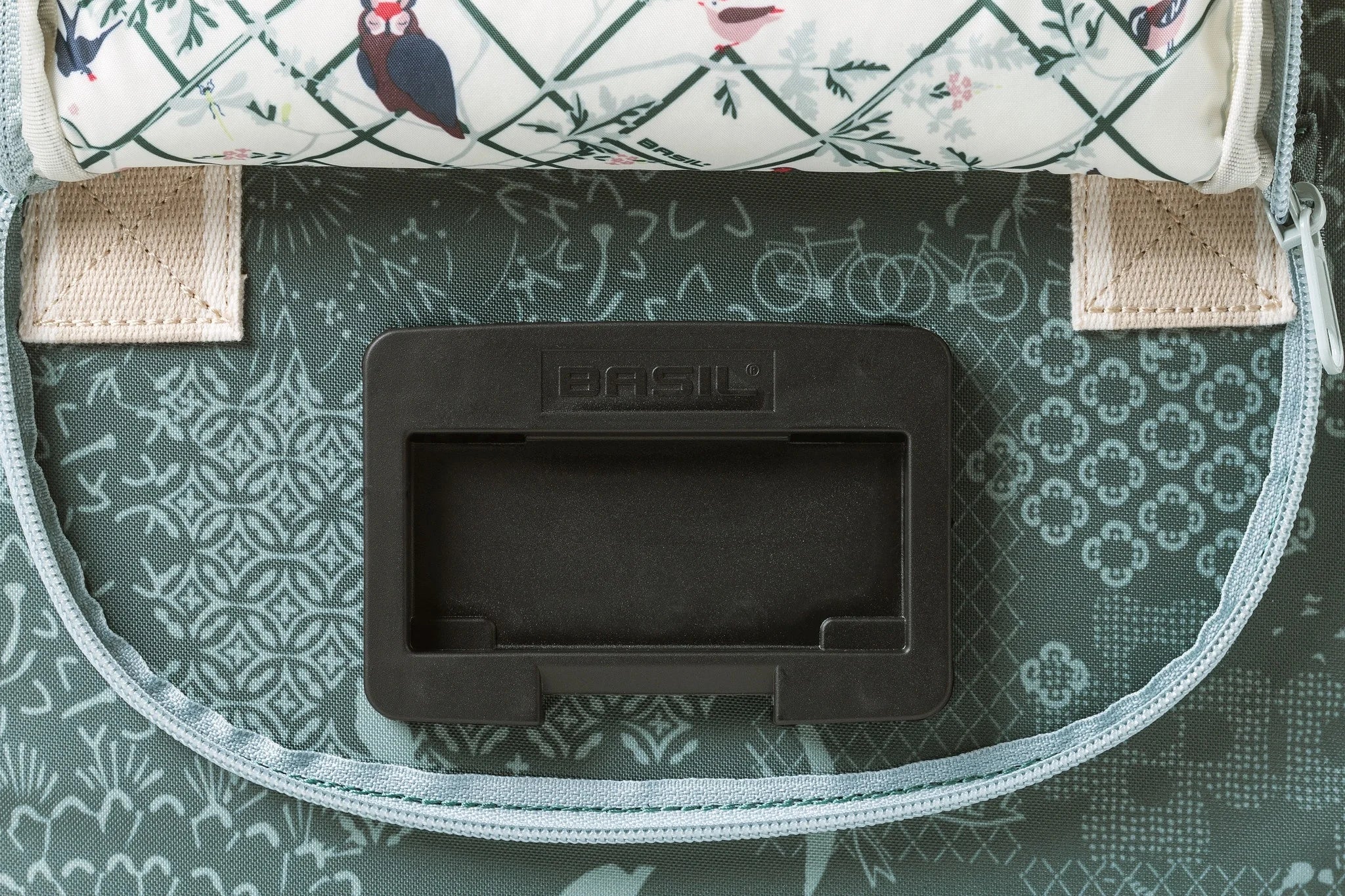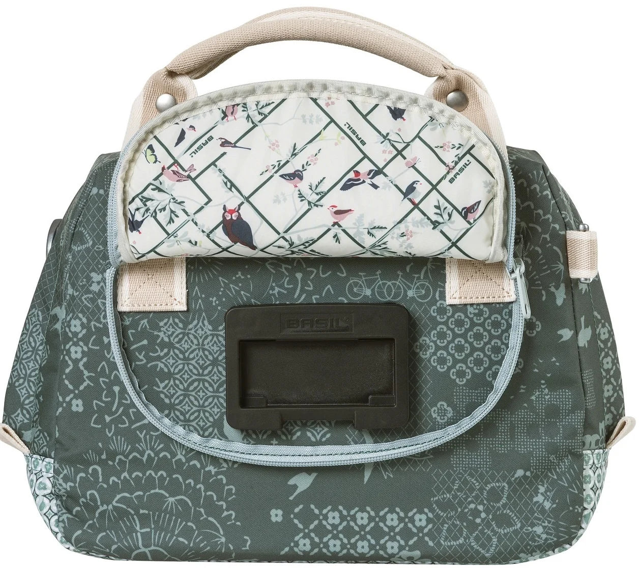De Basil Bohème City bag is een elegante groene hand-, schouder- en stuurtas in èèn, met stijlvolle bohemien print. Een fietstochtje naar het terras in de stad of een dag winkelen met die vriendin, je kan al snel niet meer zonder deze Boheme City Bag. De tas heeft een stevige binnenvoering, een ritsvak en een inhoud van 8 liter. Ruimte genoeg voor je portemonnee, een flesje water en andere benodigdheden. Door het waterafstotende polyester blijven je spullen droog tijdens een kleine regenbui. De kunstlederen details en de vrolijke bohemien print met grafische kruissteekpatroon en vogelsilhouetten, zorgen voor een trendy uitstraling. Door het afneembare schouderhengsel, is de tas ook als schoudertas te dragen. De tas is vast te maken dankzij de voorgemonteerde Basil KF adapterplaat. Daarmee klik je de tas eenvoudig op bijvoorbeeld de Basil KF stuurbochthouder. Dit systeem is niet inbegrepen. In het donker ben je beter zichtbaar door de reflectiedetails.