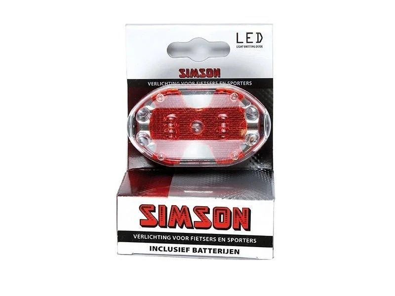 Simson Batterij Achterlicht met 5 rode led’s en handige aan/uit knop. Klik het achterlicht eenvoudig vast aan een riem of monteer deze met behulp van een kruiskopschroevendraaier en de meegeleverde bevestigingsring op de zadelpen.Het fietslampje kan vervolgens eenvoudig in en uit de bevestigingsring worden geklikt.Inclusief 2 x AAA batterijen.