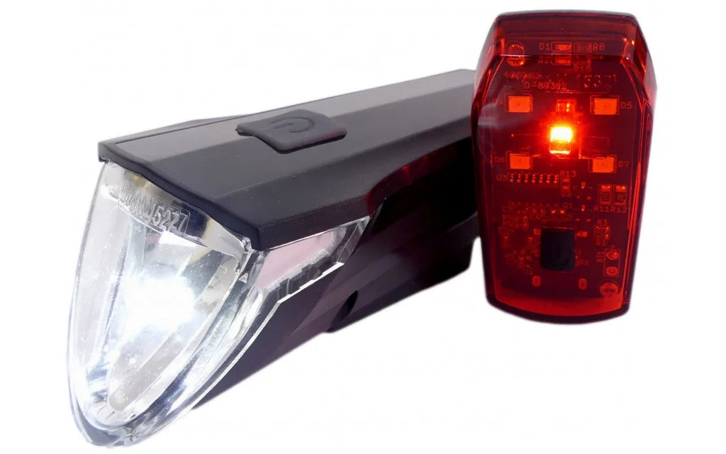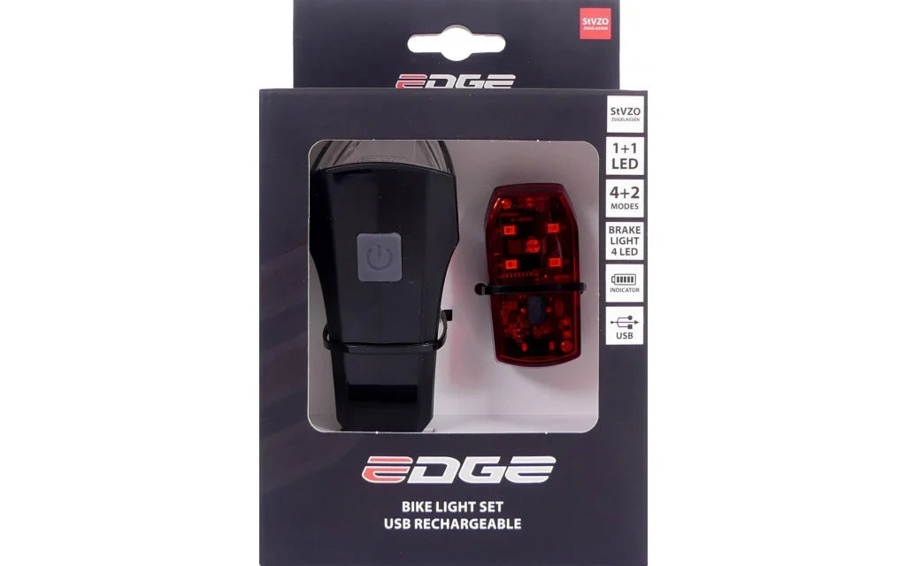 De Verlichtingsset Edge Razor 60 Lux - USB (StVzo goedgekeurd) bestaat uit een krachtige LED batterij-koplamp en een elegante LED achterlicht met remlichtfunctie. Beide lampen maken gebruik van heldere LED's en worden opgeladen via USB.